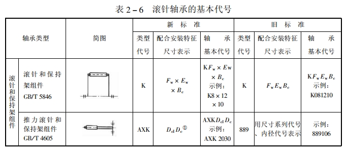 滾針軸承基本代號由軸承類型代號和表示軸承配合安裝特征的尺寸構(gòu)成。類型代號用字母表示,表示軸承配合安裝特征的尺寸,用尺寸系列、內(nèi)徑代號或者直接用毫米數(shù)表示。類型代號和表示配合安裝特征尺寸的軸承基本代號見表2一6。