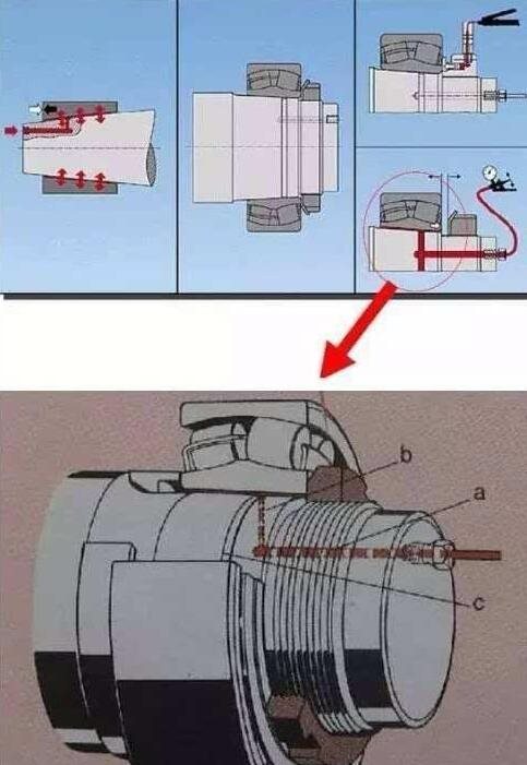 拆卸比較小型的帶緊定套軸承,用緊固在軸上的擋塊支撐內(nèi)圈,將螺母轉(zhuǎn)回幾次后,使用墊塊用榔頭敲打拆卸 。大型軸承,利用油壓拆卸更加容易,在錐孔軸上的油孔中加壓送油,使內(nèi)圈膨脹拆卸軸承的方法。操作中,有軸承突然脫出的危險(xiǎn),最好將螺母作為擋塊使用為好。