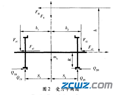 列車輪受力平衡圖如圖2所示,F(xiàn)v為車輛隨機垂向動載荷; FH為車輛隨機橫向動載荷;h為車輛載荷中心到軸頸根部距離(h=125 mm);b1,b2為軸承載荷中心到車輛載荷中心距離( b1 = b2 =978 mm. ),R為車輪半徑; QH , Qv分別為車輪與軌道接觸的約束力。車輛的隨機動載Fv,F(xiàn)H