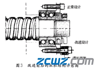 根據(jù)FAG軸承樣本中的軸承承載能力圖,絲杠軸承ZKLF2575的極限承載力約為5500 N,而軸系溫升產(chǎn)生的力達(dá)到15438 N,遠(yuǎn)大于軸承的極限承載能歷從而導(dǎo)致軸承早期失效。通過分析和計算,失效原因為絲杠在運轉(zhuǎn)過程中溫升過大,絲杠伸長,增加了軸承的載荷,導(dǎo)致軸承發(fā)生失效。