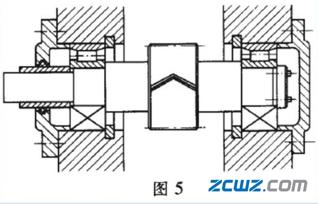要求左右雙向游動的軸,可采用兩端游動的軸系結(jié)構(gòu),如一對人字齒輪軸。由于其本身的軸向限位作用,它們的軸承內(nèi)外圈和軸向固定應(yīng)設(shè)計成只保證其中一根軸相對機座有固定的軸向位置,而另一根軸上的兩個軸承都必須是游動的,以防止齒卡死或人字齒的兩側(cè)受力不均勻,如圖5所示。此時兩端軸承都不受軸向力。