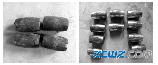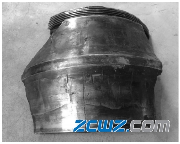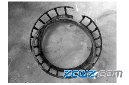 此調(diào)心滾子軸承在運(yùn)轉(zhuǎn)過程中導(dǎo)致嚴(yán)重?fù)p壞,內(nèi)圈表面嚴(yán)重?zé)齻?,最終導(dǎo)致軸承失效,無法使用。圖1為此軸承的整體外圈,圖2為此軸承內(nèi)圈碎片及軸套外觀,圖3位此軸承的滾子表面圖,圖4為此軸承的保持架。