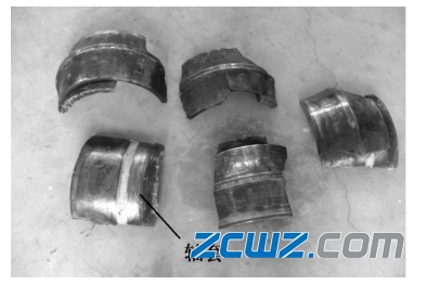 4 粒滾子表面腐蝕較嚴(yán)重,剩余滾子表面也有銹跡;滾子工作表面均有擠壓變形痕跡( 圖 3) 。保持架表面腐蝕嚴(yán)重,其中一件已斷裂( 圖 4) 。