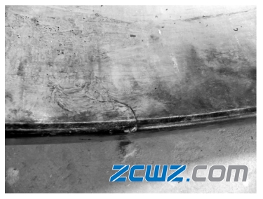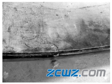 一裂紋從外圈端面延伸至滾道表面( 圖 5) ;外圈滾道上運(yùn)轉(zhuǎn)軌跡發(fā)生偏斜,一側(cè)磨痕靠近一端面倒角處,另一側(cè)磨痕距另一側(cè)端面處約30 mm,滾道表面有燒傷現(xiàn)象,如圖 6 所示。