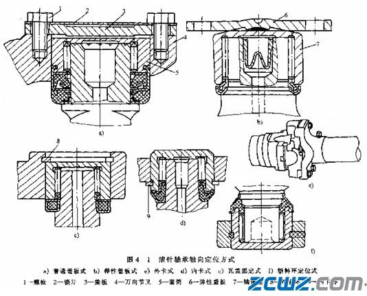 目前常見的滾針軸承軸向定位方式有蓋板式(圖4—1a、b)、卡環(huán)式(圖4—1c、d)、瓦蓋固定式(圖4—1e)和塑料環(huán)定位式(圖4—1f)等。