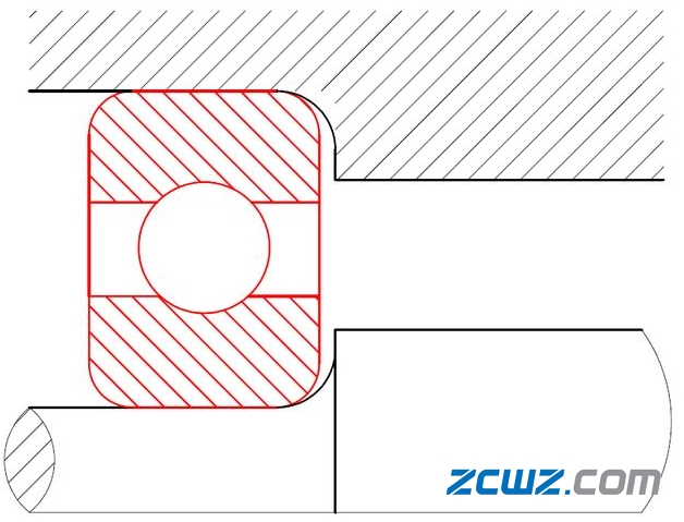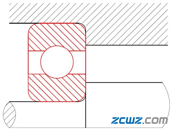 從上圖我們可以看出軸承裝入軸箱和軸之間,其倒角均比軸承箱與軸肩的倒角要大,軸承的倒角必須比這個(gè)圓弧大才能保證軸承貼合到軸向定位面。