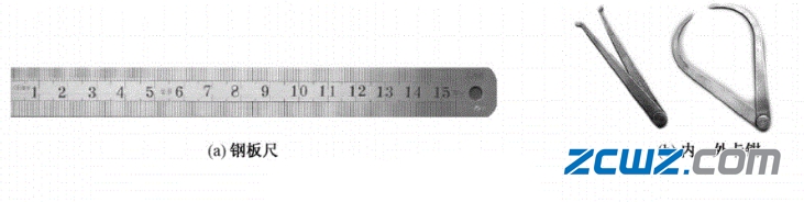 (1)測量尺寸常用量具有:鋼板尺、外卡鉗和內(nèi)卡鉗(三者可以配合使用)如圖5所示