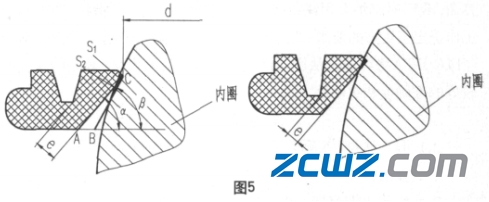 主要是采用減少密封圈唇部與內(nèi)圈球面的過盈量來處理,即加大密封圈內(nèi)徑d(見圖5),使密封圈唇部與球面接觸量減少。其次是減少密封圈的腰部尺寸e,讓密封圈唇部更有彈性,減少密封圈與內(nèi)圈球面的接觸壓力。另外在密封圈設(shè)計時,張開角α不宜太大,從圖5可以看到,張開角從α到β逐漸加大,直線距離就從A點(diǎn)到B點(diǎn),直線BC與內(nèi)圈接觸面積為S1+S2比直線AC與內(nèi)圈接觸面積S1整整大了S2的接觸面積。
