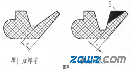 對于這種現(xiàn)象,主要解決方法是減少密封圈唇部與內(nèi)圈球面的過盈量;其次是適當(dāng)增大密封圈內(nèi)唇部的剛性和彈性,即加大唇口部分的厚度(見圖6陰影部分S)和減小密封圈腰部尺寸e。只有密封圈的唇口有足夠的剛性和彈性,在軸承擺動時才不會發(fā)生反咬。