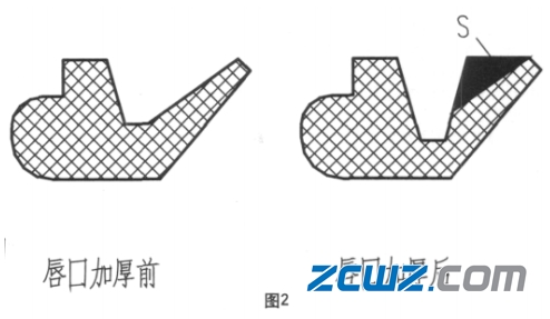 ②軸承密封圈內(nèi)唇口變形而造成的喇叭口,主要是內(nèi)唇口太薄,密封圈在注塑卸料過程中造成密封圈唇口變形,因此,這種情況須加大密封圈內(nèi)唇厚度(見圖2陰影部分);