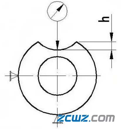 軸承內(nèi)圈車加工小擋邊外徑按照產(chǎn)品圖紙要求為“-”公差,通常為-0.35~-0.15mm,而設(shè)計的缺口的深度尺寸一般只有基本尺寸,無公差。實(shí)際加工根據(jù)目前的機(jī)床精度公差控制在±0.2mm范圍之內(nèi),而缺口深口尺寸測量是以小擋邊的外徑基準(zhǔn)測量的(如下圖2)。油溝的深度尺寸公差根據(jù)目前加工行業(yè)標(biāo)準(zhǔn)按±0.15mm控制,這樣對于深度(小擋邊外徑至油溝中心的距離)淺的小擋邊,通常深度尺寸不超過3mm,實(shí)際加工中有可能產(chǎn)生公差累積疊加效應(yīng)(擋邊外徑、缺口深度尺寸為最小尺寸,油溝深度為最大尺寸),最終造成滾子端面與擋邊接觸面積最小,有時接觸部位甚至接近油溝處。因此,在缺口處稍加用力將滾子沿缺口撥出。而對于較深擋邊,由于其本身與擋邊接觸面積較大,相對來說公差影響小,有時甚至可以忽略。