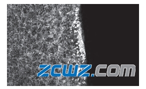 軸承套圈淬回火拋光后發(fā)現(xiàn)表面有明顯的麻點,軸承零件脫碳層是在金相顯微組織下的典型形態(tài)是:外層是白亮的鐵素體,之下是貧碳層過渡到正常組織區(qū)域。脫碳嚴(yán)重的軸承套圈拋光后表面明顯的麻點如圖9所示,線切割后觀察縱斷面發(fā)現(xiàn)脫碳層深度遠(yuǎn)遠(yuǎn)超過標(biāo)準(zhǔn)的規(guī)定,如圖10所示。其原因是套圈在淬火加熱過程中,淬火加熱爐內(nèi)的碳勢低,經(jīng)調(diào)查是由爐頂?shù)稳爰状嫉目灼渲杏幸粋€被堵塞,導(dǎo)致滴入爐內(nèi)甲醇量少所致。采取的措施為防止?fàn)t頂進(jìn)氣管結(jié)碳,影響保護(hù)氣氛碳勢,要求操作工每班必須疏通1~2次